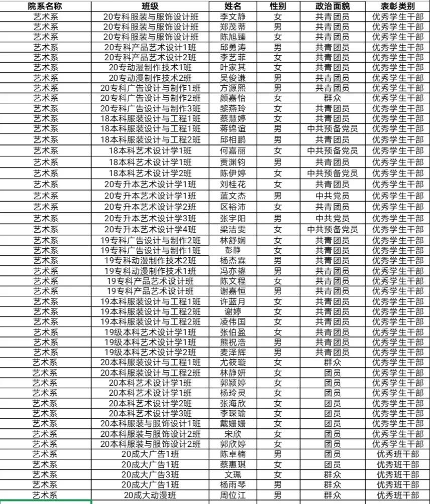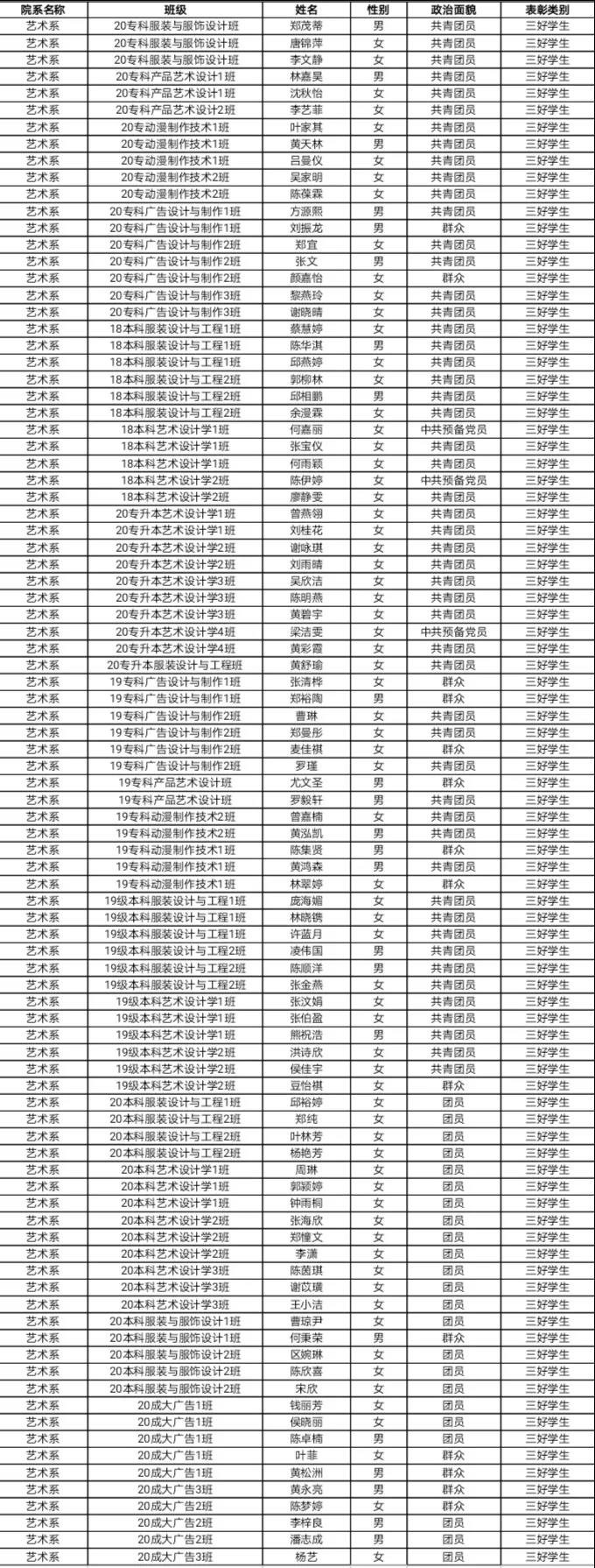 经班级资助工作评审小组推荐、系资助工作评审小组审核,决定推荐郑茂蒂等92名同学参评“三好学生”、李文静等47名同学参评“优秀学生干部”、18本科艺术设计学1班等六个班级参评“先进班集体”。具体名单见附件,现予以系部公示。
