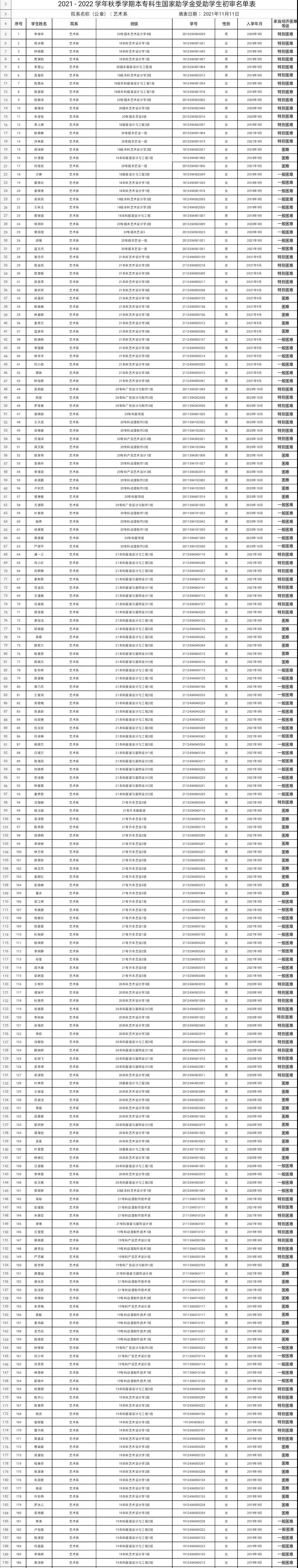 艺术系关于对拟获 2021-2022 学年秋季学期国家助学金学生名单的公示,经班级资助工作评审小组推荐、系部资助工作评审小组审核,决定推荐李俊华等 188位同学符合“2020-2021 学年秋季学期国家助学金申请条件”具体名单见附件(图片);现予以公示。对推荐名单如有异议,请以书面形式并署真实姓名,于 2021年11月18日前向学院辅导员办公室反映。