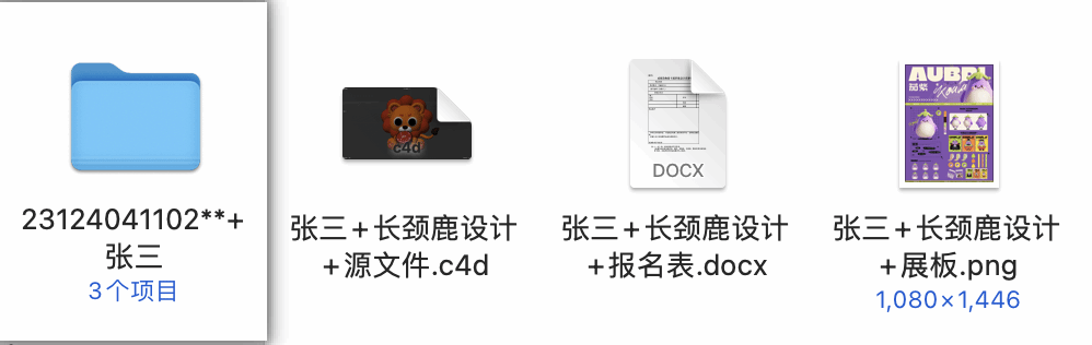 (2)参赛作品命名:严格按照“参赛人姓名+作品名称”的形式,若有多张作品,则尾缀(01,02,03…),例如“张三+长颈鹿设计(01)”,命名未按要求格式的作品一律视为自动放弃比赛;
