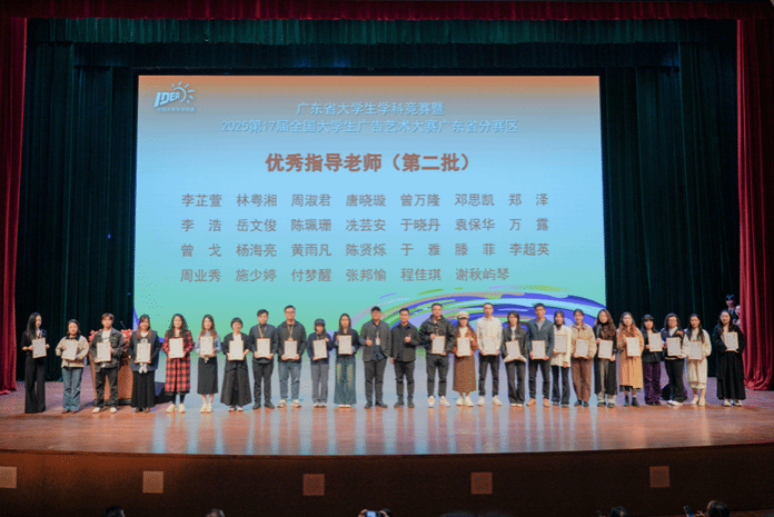 (活动合影) 在本次颁奖典礼中,我院凭借出色的赛事组织与学生指导工作,再度荣获“广东赛区优秀组织单位”称号,张高美副院长代表学院上台领奖。视觉传达设计教研室主任刘婷获评“优秀组织工作者”,赵中华、李松原、于雅三位教师因指导成绩突出,被授予“省级优秀指导教师”称号。