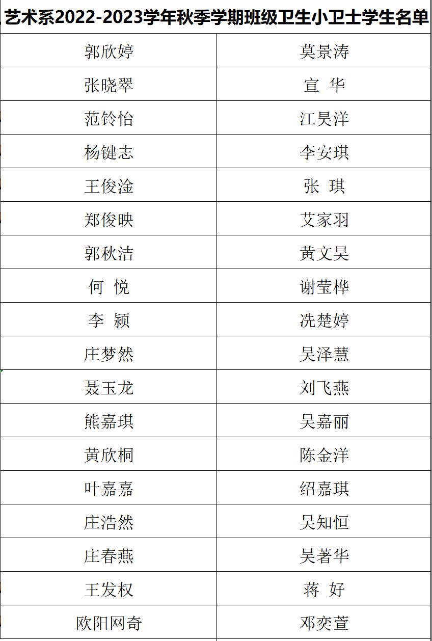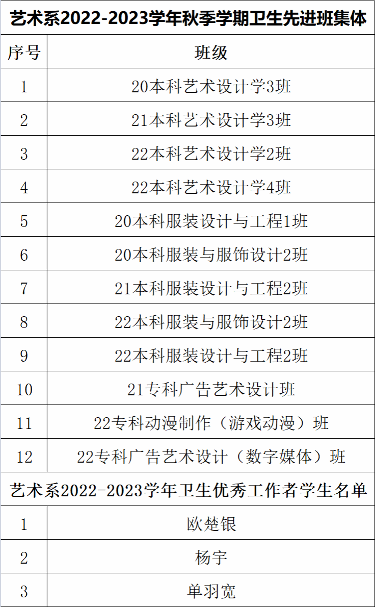 本网讯(艺术系新闻中心 陈月球/钟紫霞)为有力推进我系卫生工作,增强学生文明意识、卫生意识、环境意识,各班级通过自荐和系部卫生工作小组综合推选方式,评选出艺术系2022-2023学年秋季学期卫生先进个人、卫生先进班集体、卫生“小卫士”、卫生优秀工作者。