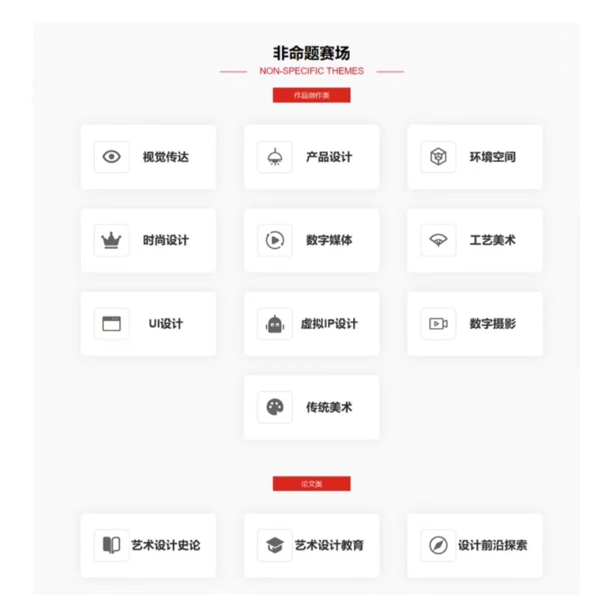 1)作品创作类:视觉传达/时尚设计/UI设计/产品设计/数字媒体/虚拟IP设计/环境空间/工艺美术/数字摄影/传统美术