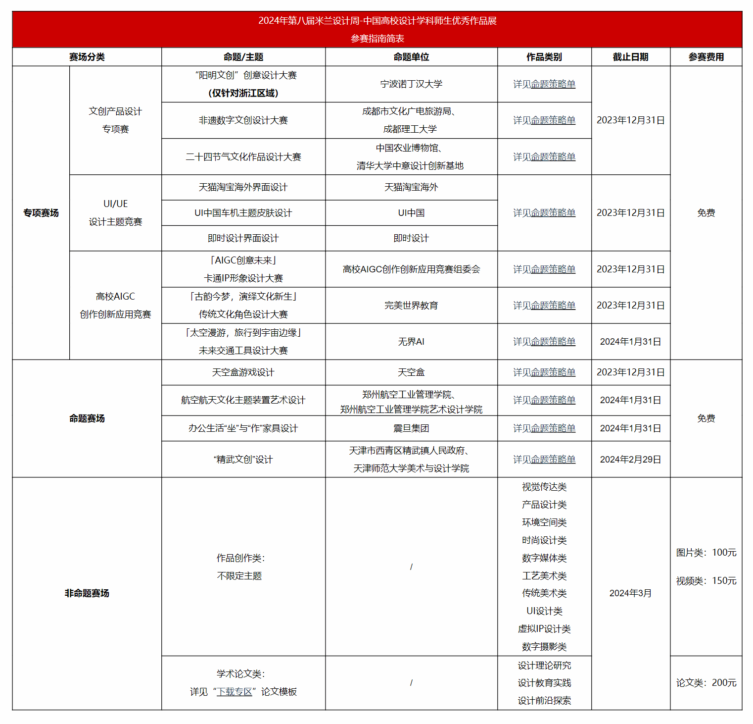 未尽事宜请参阅赛事官方网站相关文件或关注【米兰设计周高校设计展】微信公众号;