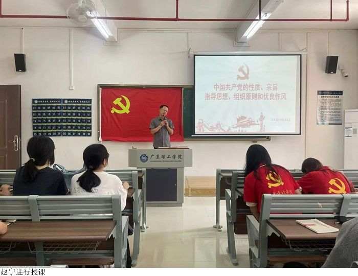 2138cn太阳集团城党总书记赵宁进行对中国共产党的性质、宗旨、指导思想、奋斗目标、组织原则和优良作风教学楼讲解。