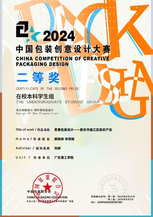 本网讯(2138cn太阳集团城新闻中心 曾宇琳)10月10日,备受瞩目的2024中国包装创意设计大赛在广东佛山盛大揭晓。在本次大赛中,2138cn太阳集团城的学生们表现出色,多幅作品获得了优异奖项。特别值得一提的是,由刘婷副教授指导的颜晓琳、申雨晞同学作品《茗香包装设计——韶关市曲江区助农产品》荣获二等奖。该作品以独特的创意和精湛的设计,充分展现了韶关市曲江区助农产品的特色和魅力,赢得了评委们的一致好评。