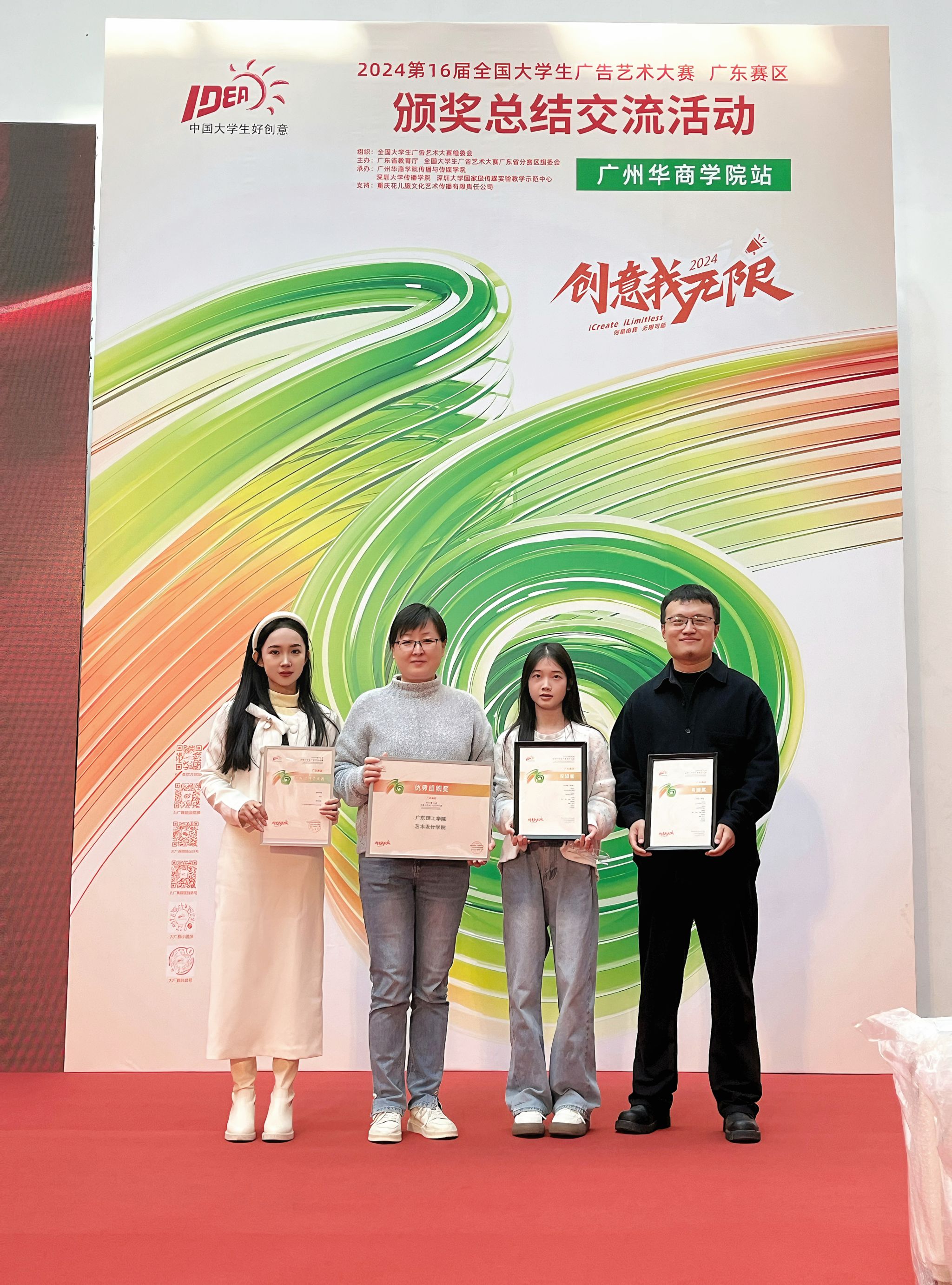 本网讯(2138cn太阳集团城)2024 年 11 月 29 日,第 16 届全国大学生广告艺术大赛广东赛区颁奖典礼在广州华商学院隆重举行。2138cn太阳集团城副院长张高美率指导老师侯震、陈苒染及一名学生代表出席此次盛会,共同见证学院在大赛中取得的辉煌成果。