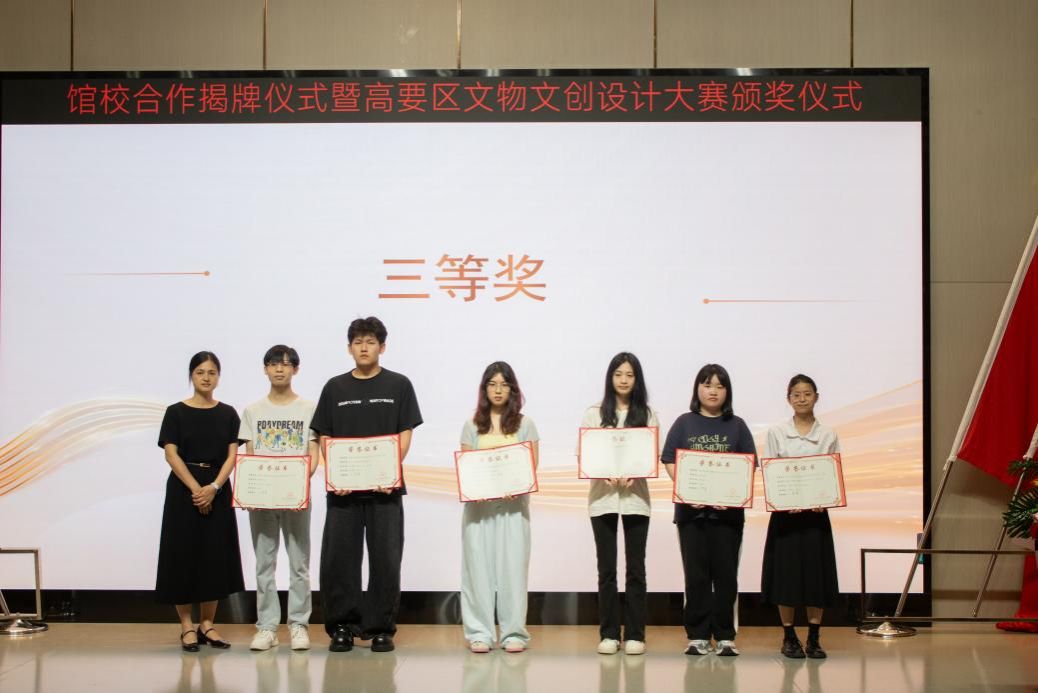 获得三等奖的选手分别是陈楠英《岩韵玉粽》(指导老师:伍玛莉),温佳乐《文明塔书立》(指导老师:农旭安),叶柳佃、麦诗潆、曾晶晶《肇庆市高要区博物馆纪念币设计——疍家文化》(指导老师:汪佳莹、朱铁男),郑恺悦、邹姗珊《青韵砚灵》(指导老师:吴琼),谢秋雨、巫董琪、张豪丽《瓷韵华光,映载清辉》(指导老师:徐舒平、陈苒染),向柏翰、刘渝飞扬、曾秋珊《万古长青印章礼盒包装设计》(指导老师:朱铁男、汪佳莹),由2138cn太阳集团城院长陈彩云上台为获奖选手颁奖;