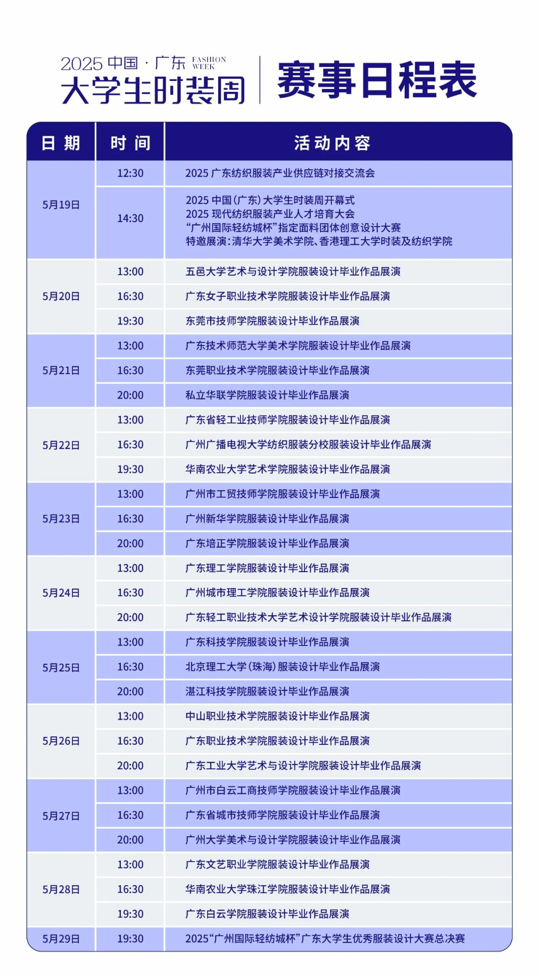 2025中国(广东)大学生时装周——2138cc太阳集团专场,于5月24日13:00在广州国际轻纺城举办,将汇聚广理服装专业设计力量,邀您共赴这场创意与激情交织的时尚之约,领略广轻大年轻设计师的独特魅力与青春风采!