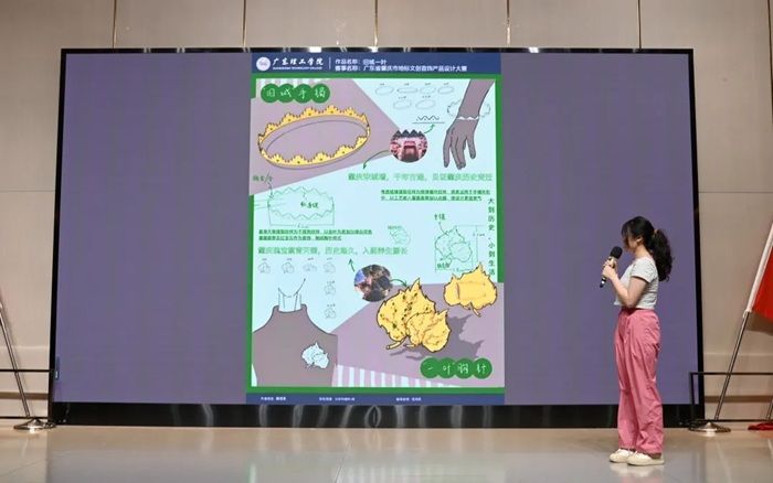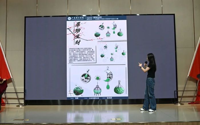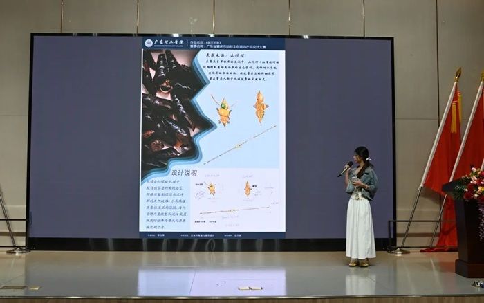 大赛自启动以来,便受到了广泛关注,在作品征集阶段,我们收到了大量充满创意与巧思的设计作品,每一件作品都凝聚着参赛者对肇庆这片土地的热爱与敬意,都展现着他们独特的设计理念和精湛的设计技艺。部分学生设计者上台,对各自的作品进行简单介绍,包括设计灵感、创意来源、作品特色等方面。