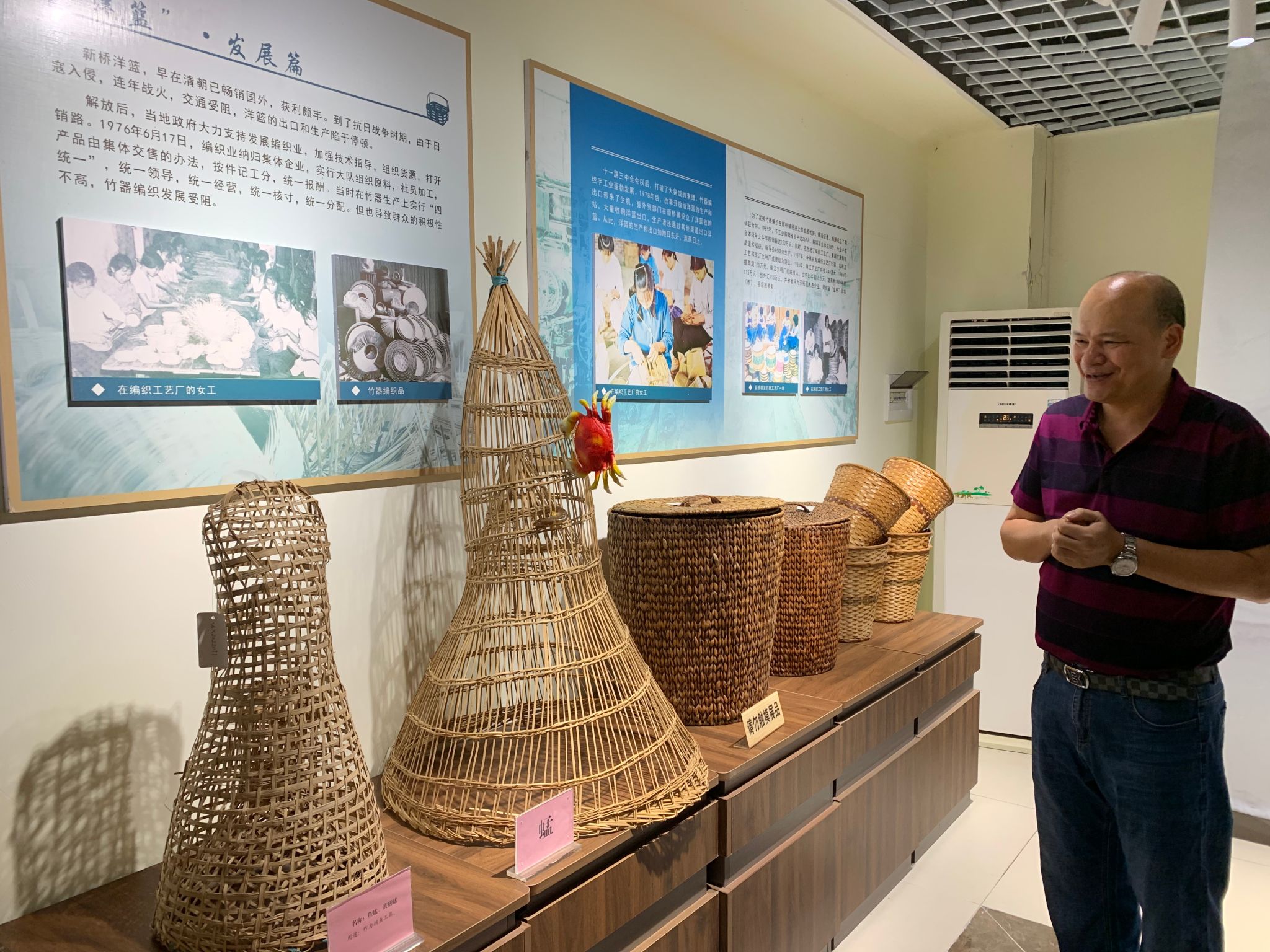 新桥镇竹编技艺始于元朝,至今已有600多年历史,从清朝咸丰年间其,新桥编制制品畅销海外,因此被赋予“洋篮”称号。新桥竹编以肇庆广宁特产竹材为原料,素以编织细腻、造型精巧闻名,曾是蜚声海外的出口工艺品,并于2009年成功入选肇庆市非物质文化遗产名录。调研期间,学院教师团队深入非遗基地,观摩了船篮、坎箩、菜笠、黄鳝篓等传统竹编制品。这些兼具实用与艺术价值的器物生动展现了竹篾交织的匠心之美,而陈列的柴刀、链锯、蔑刀等传统工具,更让教师们感受到手工艺人“以竹为媒、以手为器”的匠心传承。