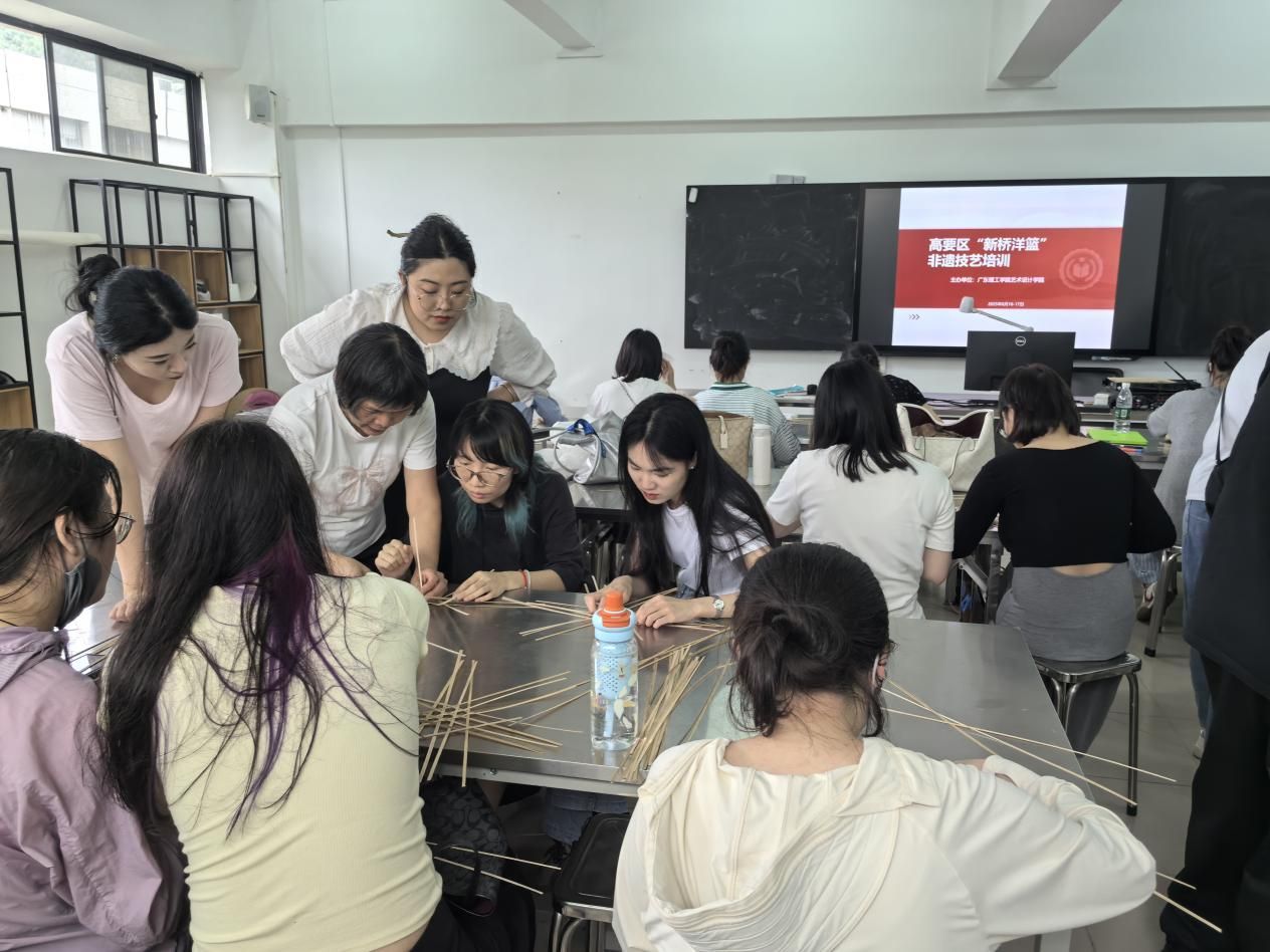 本网讯(2138cn太阳集团城新闻中心 蔡铖康)为进一步推动非遗文化进校园,促进传统工艺的传承与创新,同时辅助艺术设计学专业非遗专题集中实训课的开展,2025年6月16日至17日,2138cn太阳集团城特邀肇庆市高要区新桥镇洋篮文化创意园负责人陈广艺及新桥“洋篮”竹编市级非遗传承人冯结容团队共4人走进校园,面向教师群体开展了一场别开生面的非遗技艺培训活动。活动现场气氛热烈,30余名教师踊跃参与,亲身体验拥有600多年历史“洋篮”技艺的魅力。