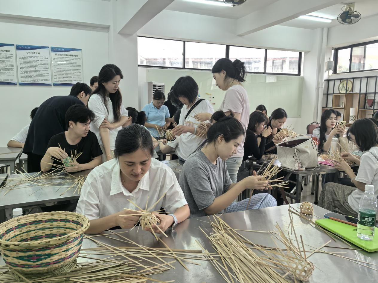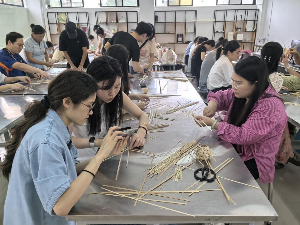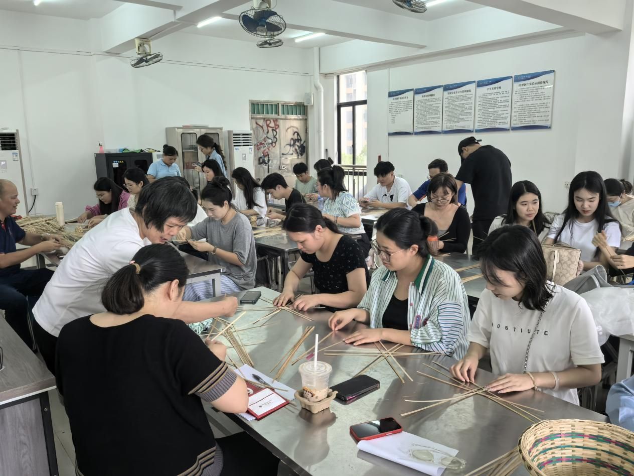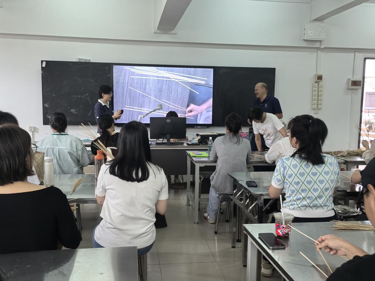活动先由洋篮文化创意园负责人陈广艺站长进行导入讲解,带领教师们深入了解新桥“洋篮”竹编的起源、发展及文化价值。随后,非遗传承人团队在现场技艺娴熟地演示了“洋篮”竹编的编制技法,包括选材、起编、立体造型等核心工序介绍,细致讲解了编织的步骤、编织要点、结构设计等传统工艺流程。学院领导带领教师们在传承人团队的指导下,动手完成了小型竹编作品的制作,切身感受“以手为器、以心为艺”的传统工艺精神。