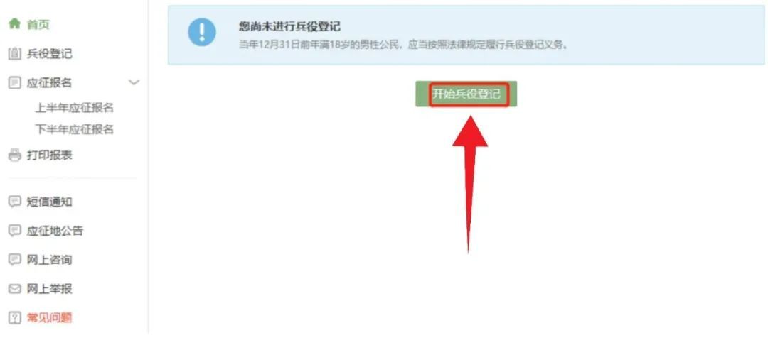 第四步,登录系统以后,如果出现以下界面,适龄男青年请点击“开始兵役登记”按钮进行兵役登记,如果已经登记过,请忽略此步骤;