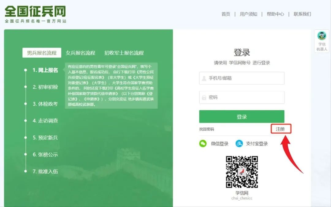 第三步,如果此时还没有登录账号,会出现以下界面,用学信网账号进行登录就可以了。但如果没有学信网账号,请点击“注册”按钮,进行注册,注册完之后就可以登录了。注意:注册学信网账号必须实名,一定要用真实姓名和身份证认真填写,兵役机关将对有效信息进行审核;