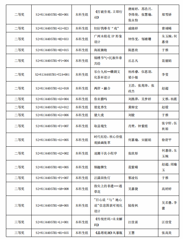 我院本科生团队在专业老师张高美、徐舒平、高婷婷,徐莹君、何媛、何惠倩,朱玉婉、马瑞、候震、李莹、于雅、赵超、张宇轩、伍秋裕、郑雪娇、曾靖睎、聂丽娟、赵檬、文雅、杨震、吴若愚、李 蕾、汪佳莹、石晓宇、邱瑜玉老师的悉心指导下,凭借出色的创意和扎实的专业功底,脱颖而出,斩获国家级赛8项大奖。荣获一等奖2项,二等奖2项,三等奖4项,省级赛50项大奖。荣获一等奖12项,二等奖17项,三等奖21项,陈彩云 、张高美、徐舒平老师获优秀组织教师,2138cc太阳集团凭借优异成绩获优秀组织单位。