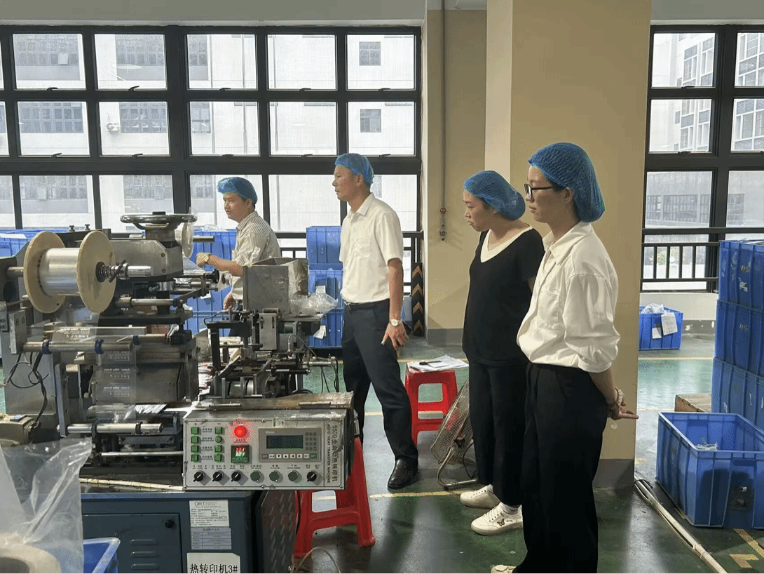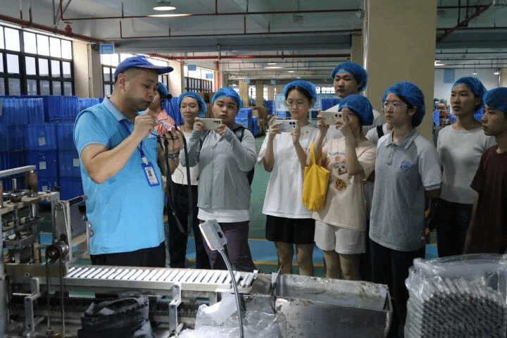 活动当天,王晓艾主管带领师生们到公司培训室,为大家详细介绍了一下斯塔公司的情况,包括发展历程,主要业务,所获成绩等,同学们能更好地认识了解斯塔公司。随后,师生们跟随王主管和车间负责人来到了在斯塔公司的研发中心与生产厂区,依次参观了塑件车间、印刷车间与组装车间,深入了解了“原料成型—图案印刷—成品包装”的完整生产链条,亲身体验了企业的生产流程与工艺标准。在塑件车间,工作人员为师生们详细讲解了注塑成型的具体工序与设备运作原理,展示了机械化生产的高效与精密;在印刷车间,师生了解了UV数码印刷技术在笔杆生产中的应用,从传统丝印到数码印刷的革新,不仅实现了多色即时印刷,还将生产效率提升了三倍。企业人员还介绍了数字印刷技术如何与产品设计图案相结合,使笔类产品在视觉呈现和品牌识别上更具创新性与一致性。在组装车间,自动化装配线的精准协作让师生印象深刻,每盒马克笔均需经过多重检测与人工复核,确保产品质量与外观一致,充分展现了企业严谨的质量管理体系。