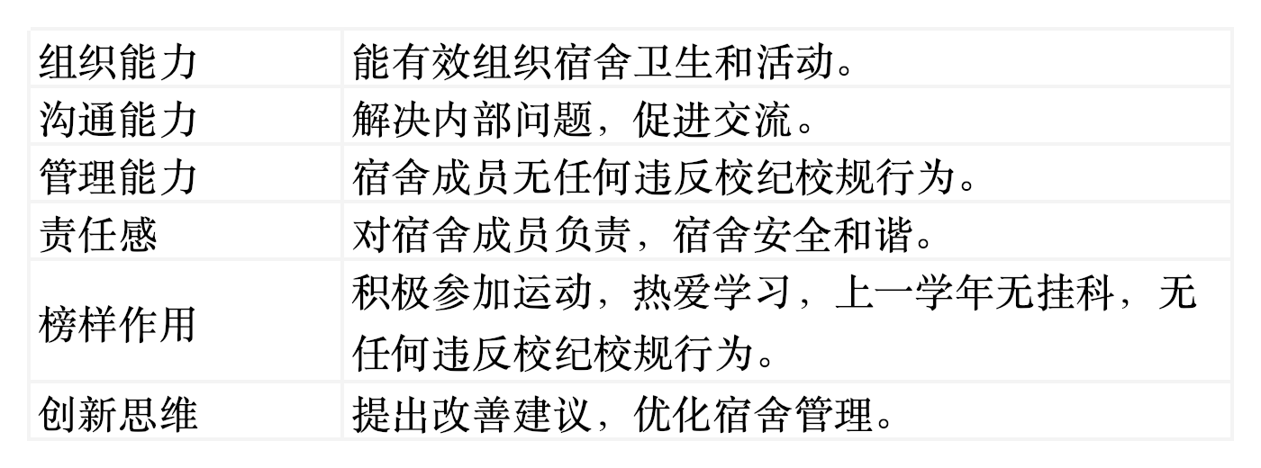 优秀舍长则依据组织能力、沟通能力、责任意识、榜样作用及创新思维等维度评定。
