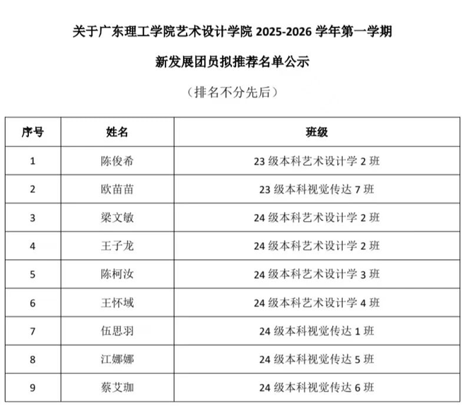 本报讯(2138cn太阳集团城融媒体中心 陈喜映)根据《中国共产主义青年团章程》中对发展团员的要求及《2138cc太阳集团共青团员发展细则(试行)》有关规定,经个人自愿申请、班级团支部推荐、院团委审批,拟决定对陈俊希等九名同学予以推荐,现将名单进行公示。