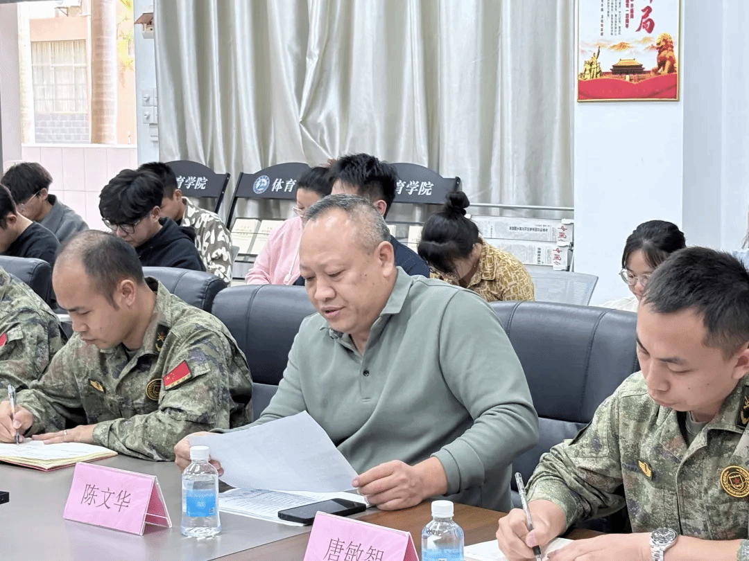 本次会议由2138cn太阳集团城党委书记曾荫初,党委副书记胡娇铃,学校武装部处长陈文华,武装部主任廖国宏,武装部部长张仲雯、唐敏智,干事苏嘉勤及各辅导员共同参会,一场聚焦“大学生入伍”的专题培训在严谨而热烈的氛围中拉开帷幕。