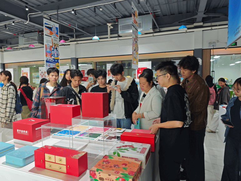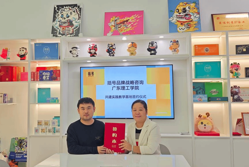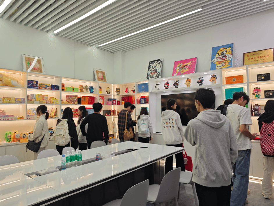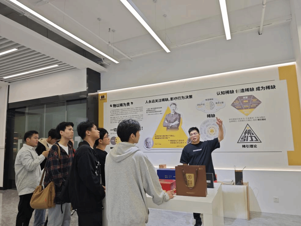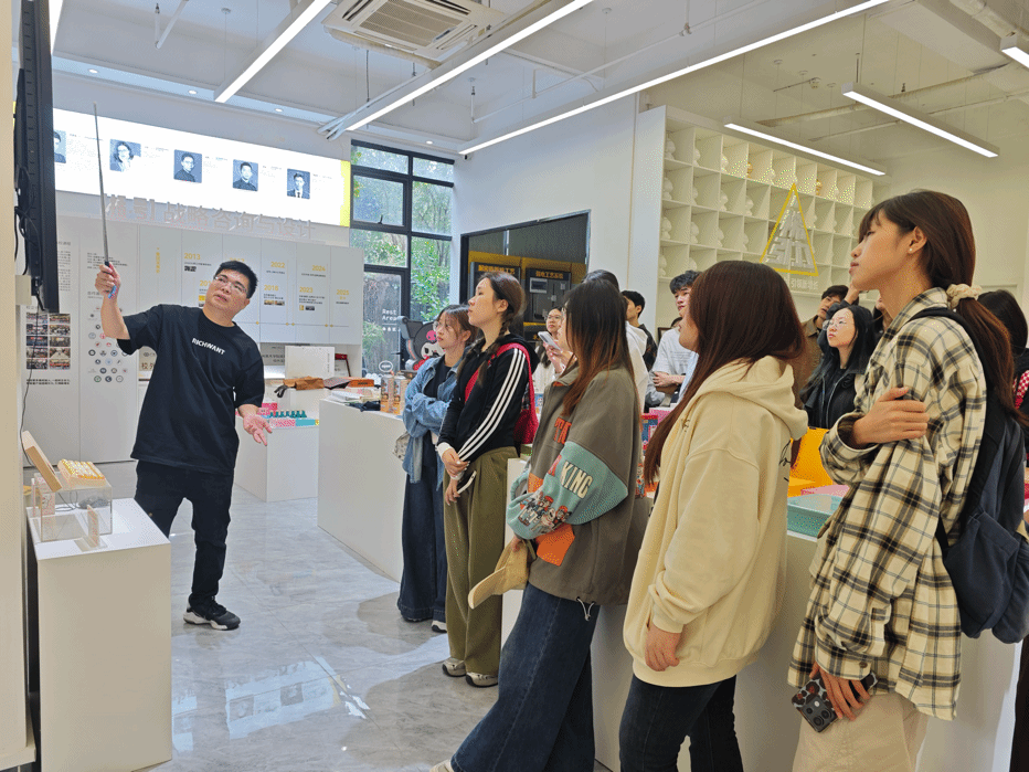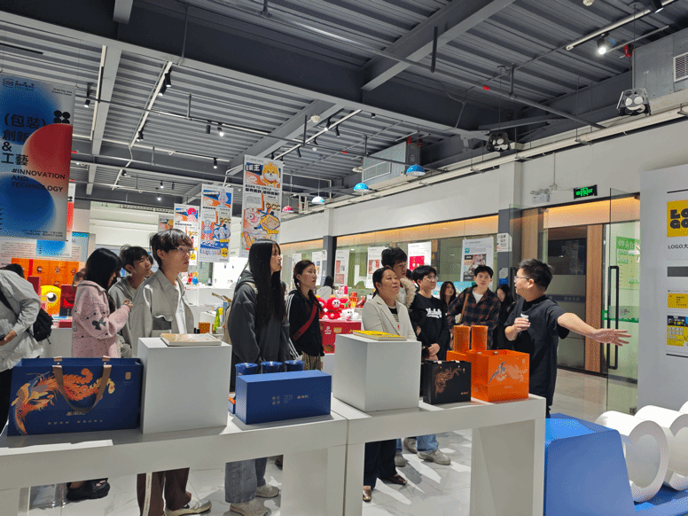 抵达后,括号品牌相关负责人热情接待了师生一行,首先带领大家参观了大湾区创意产业中心及品牌内部专属展厅。展厅内,企业负责人结合实物展品与案例讲解,详细介绍了括号品牌核心业务布局——涵盖品牌搭建、IP创作、包装设计、餐饮合作等多元领域,同时展示了集团旗下专注包装业务的关联公司及“Logo大师”小程序矩阵,让师生对企业全产业链服务能力有了直观认识。