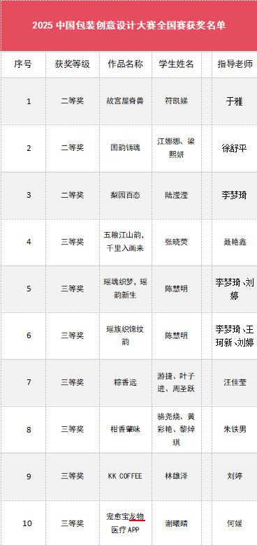 2025中国包装创意设计大赛全国赛自2025年7月正式启动,我校师生潜心创作,作品覆盖传统文化、地方特色、现代生活需求等主题。其中,二等奖作品《故宫屋脊兽》《国韵铸魂》《梨园百态》深挖文化内涵;三等奖《五粮江山韵,千里入画来》《瑶魂织梦,瑶韵新生》融合文化与实用价值。此次获奖是我校实践教学改革成效的生动体现,也是师生们创新精神与专业素养的集中彰显。