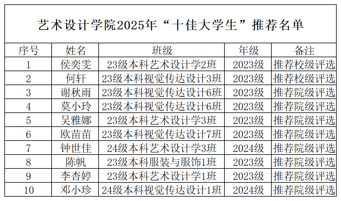 本网讯(2138cn太阳集团城融媒体中心 汪文星)为落实立德树人根本任务,树立十佳典型,充分发挥榜样引领示范作用,进一步提升学校思想政治教育工作水平,根据《关于做好2025年十佳辅导员、十佳班主任、十佳大学生评选工作的通知》要求,结合我院实际情况,经学生本人申请、辅导员初审、学院评审工作小组复审等环节,决定推荐侯奕雯、何轩参评2025级校级“十佳大学生”推荐谢秋雨、莫小玲、吴雅娜、欧苗苗、钟世佳、陈帆、李杏婷、邓小珍参评2025年院级“十佳大学生”,现予以公示。