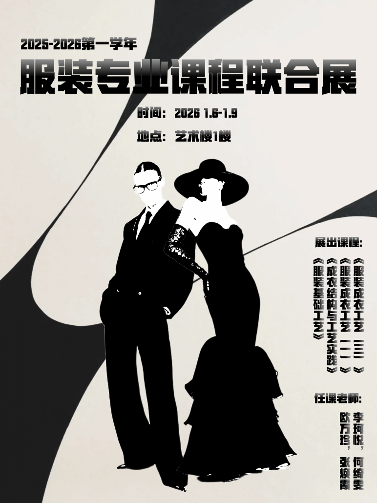 本次展览以第一学期学生作品为主,通过不同课程在设计语言、创作方法与实践路径上的交叉融合,呈现了从概念构思到视觉表达、从创意设计到产业思维的多维度教学成果。展览既是对课程教学阶段性成果的集中展示,也为师生及专业内部提供了交流与研讨的平台,反映了服装专业在教学实践中持续拓展与融合的发展方向。