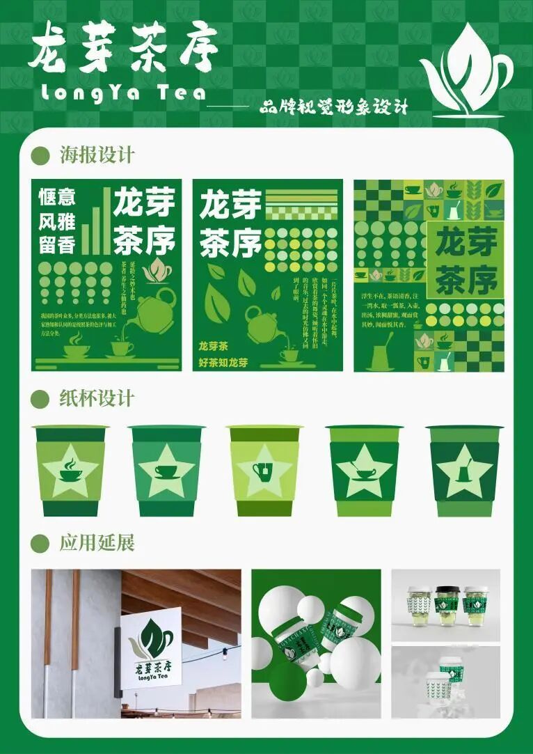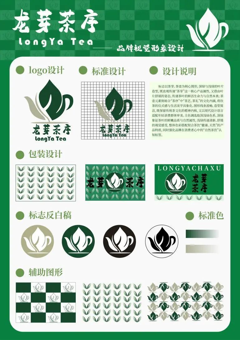 标志以茶芽、茶壶为核心图形,深绿与浅绿的叶片造型,既直观传递“茶芽”这一核心产品属性,又借由叶片舒展的姿态,传递茶叶的鲜活生命力与自然本真;茶壶元素则暗合“茶序”中“茶艺、茶礼”的文化内涵,将饮茶的仪式感与生活美学具象化。图形线条流畅、造型简洁,既保留传统茶文化的精神内核,又以现代设计语言适配年轻消费群体审美。主色调选取深浅绿色系,深绿象征茶叶的鲜嫩品质与自然属性,浅绿传递清新、舒缓的视觉感受,整体色彩搭配契合茶饮“健康、天然”的产品特质,同时强化品牌在消费者心中的“自然茶饮”认知标签。