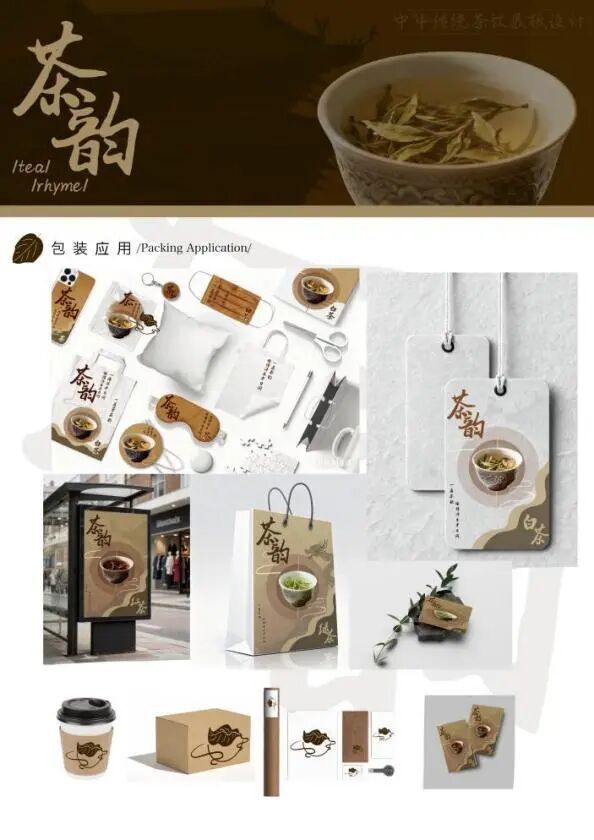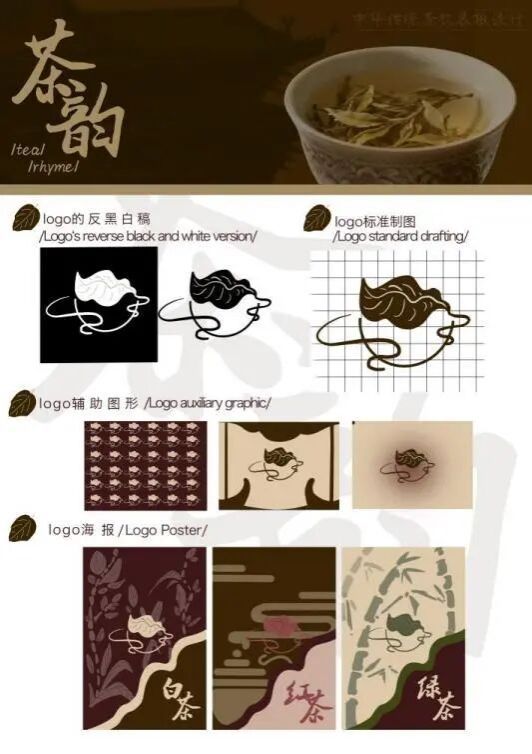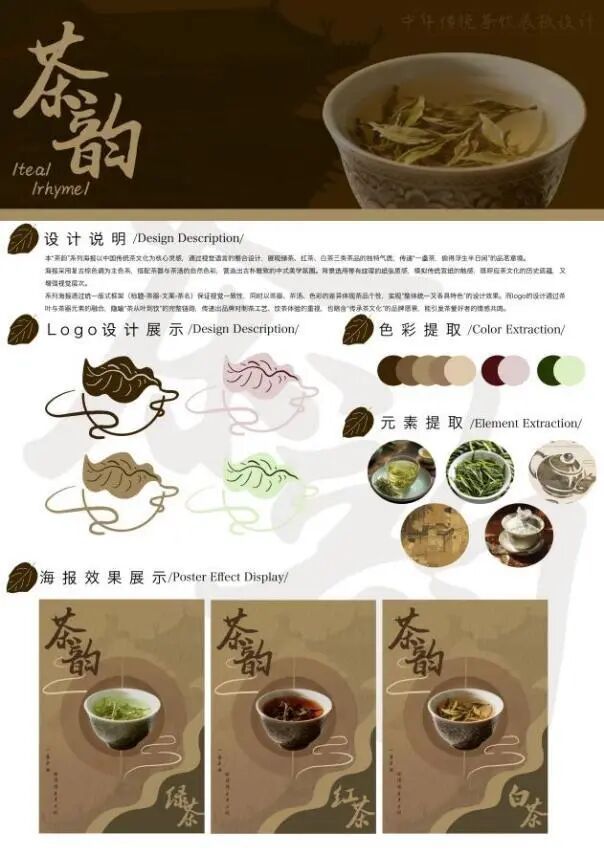 本“茶韵"系列海报以中国传统茶文化为核心灵感,通过视觉语言的整合设计,展现绿茶、红茶、白茶三类茶品的独特气质,传递“一盏茶,偷得浮生半日闲”的品茗意境。海报采用复古棕色调为主色系,搭配茶器与茶汤的自然色彩,营造出古朴雅致的中式美学氛围。背景选用带有纹理的纸张质感,模拟传统宣纸的触感,既呼应茶文化的历史底蕴,又增强视觉层次。采列海报通过统一版式框架(标题-茶器-文案-茶名)保证视觉一致性,同时以茶器、茶汤、色彩的差异体现茶品个性,实现“整体统一又各具特色”的设计效果。而logo的设计通过茶叶与茶器元素的融合,隐喻“茶从叶到饮“的完整链路,传递出品牌对制茶工艺、饮茶体验的重视,也暗含“传承茶文化"的品牌愿景,能引发茶爱好者的情感共鸣。
