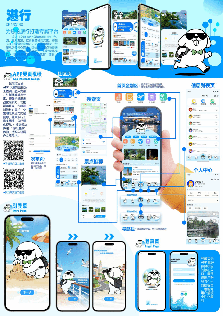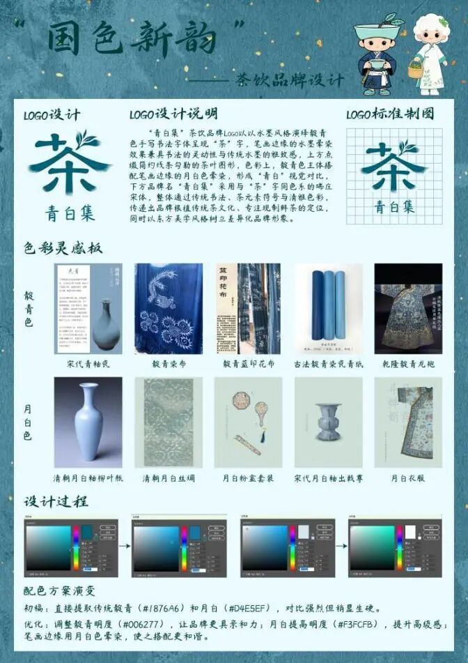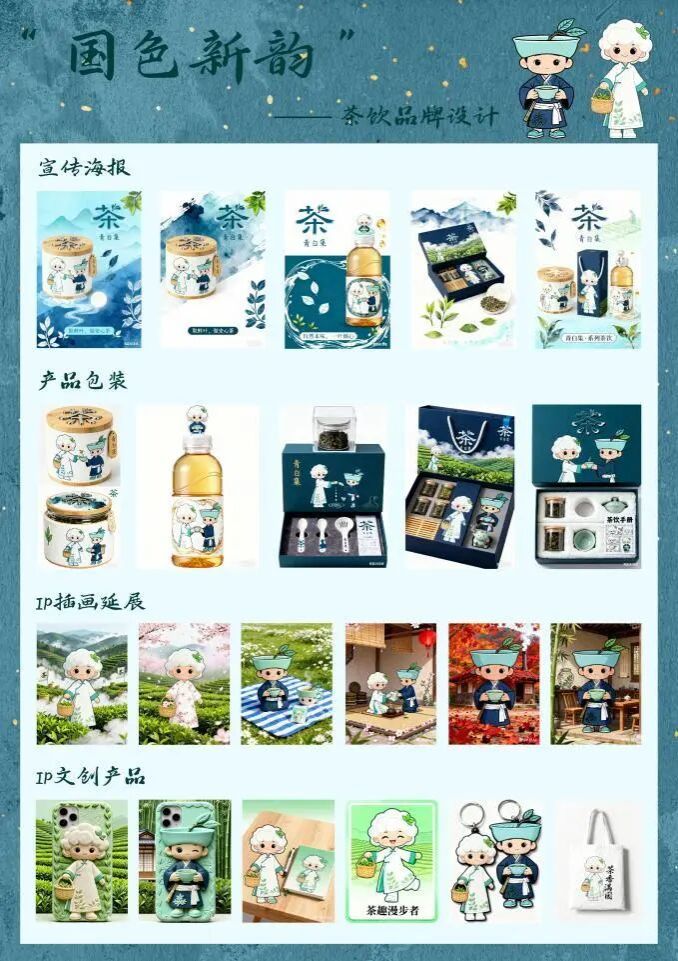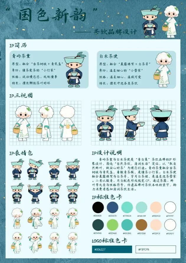 青屿茶童与白禾茶使是“青白集”茶饮品牌的IP形象设计,围绕“自然茶饮,清润生活”定位,以“取自然鲜叶,做安心好茶”为理念打造。青屿茶童融合古茶树枝与青瓷盏,着靛青茶服,是懂茶小行家;白禾茶使融合晨露棉絮与白茶芽,穿月白茶裙,是温柔泡茶管家。二者以靛青、月白配色形成视觉 CP,通过茶器、鲜叶等元素与性格符号,传递品牌对茶饮本味的坚守,助力消费者感知清润茶饮生活。