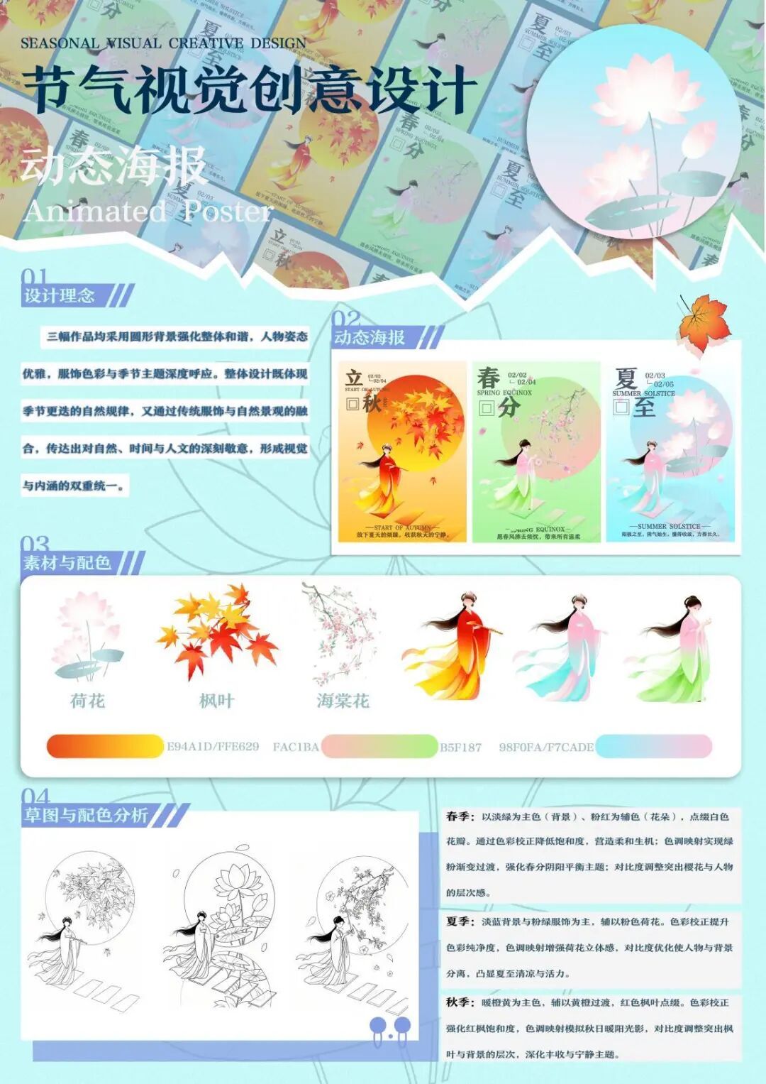 作品均采用圆形背景强化整体和谐,人物姿态优雅,服饰色彩与季节主题深度呼应。整体设计既体现季节更迭的自然规律,又通过传统服饰与自然景观的融合,传达出对自然、时间与人文的深刻敬意,形成视觉与内涵的双重统一。