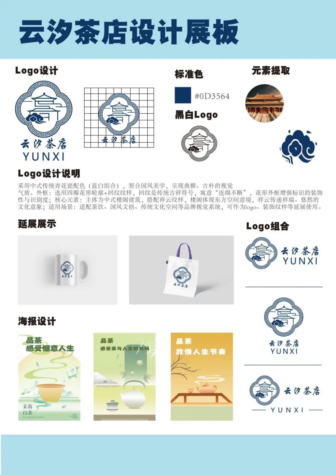 采用中式传统青花瓷配色(蓝白组合),契合国风美学,呈现典雅、古朴的视觉气质。外框:选用四瓣花形轮廓+回纹纹样,回纹是传统吉祥符号,寓意“连绵不断”花形外框增强标识的装饰性与识别度;核心元素:主体为中式楼阁建筑,搭配祥云纹样,楼阁体现东方空间意境,祥云传递祥瑞、悠然的文化意象;适用场景:适配茶饮、国风文创、传统文化空间等品牌视觉系统,可作为logo、装饰纹样等延展使用。