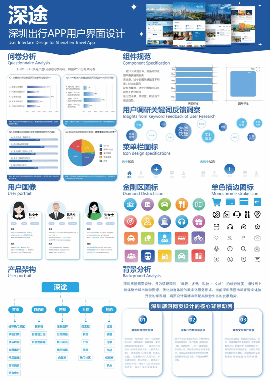 本次《京剧文化》的设计是以京剧“生旦净丑”四大行当为核心创作主题,灵感取材于京剧经典扮相和脸谱艺术的视觉特征。设计中运用数字调色技术,为生角搭配蓝调雅致色系、旦角选用红蓝明艳配色、丑角以红黄打造浓烈视觉、净角用黑白红营造诙谐质感,通过色彩差异精准区分各行当的性格特质。构图以行当典型扮相特写为视觉中心,结合统一的标题与说明文字,用简约现代的设计语言诠释传统京剧美学。海报适配公交站、地铁站等公共场景应用,让传统京剧文化以更贴合现代审美的形式实现传播。