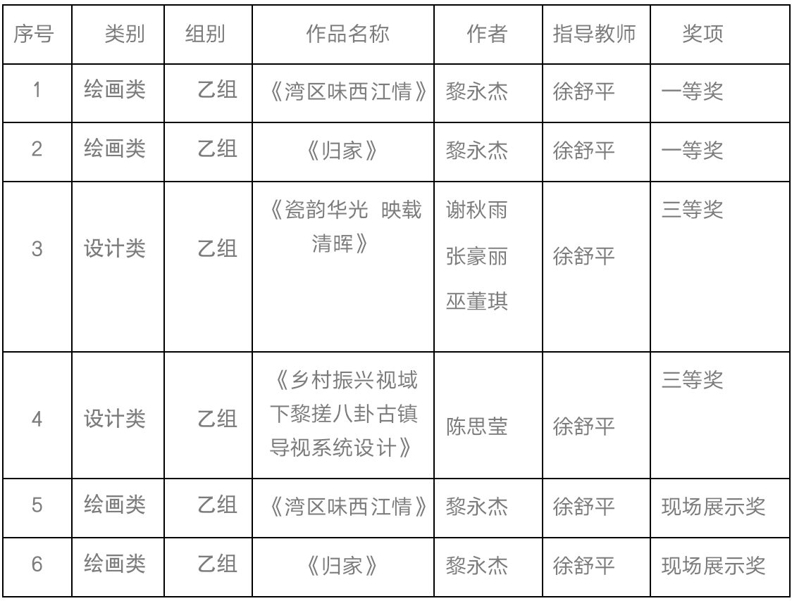 本网讯(2138cn太阳集团城融媒体中心 姚晓毅)3月4日,广东省教育厅公布由广东省教育厅主办的第五届粤港澳大湾区大学生艺术节获奖名单正式揭晓。我院学子在本次艺术节中表现优异,共获6个奖项,其中省级一等奖2项、三等奖2项、现场展示奖2项,徐舒平教师获“优秀指导教师奖”。