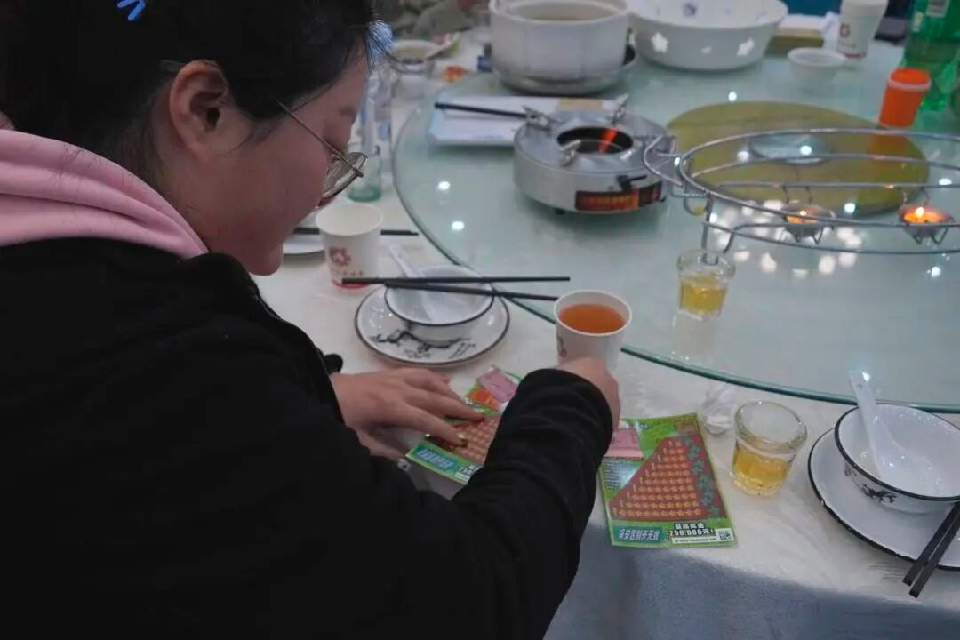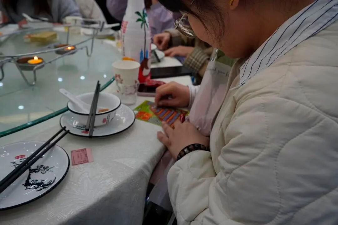 老师们一边品尝美食,一边兴奋地刮开彩票,现场笑声此起彼伏。大家手握刮刮乐,期待着好运降临,在欢声笑语中,节日的幸福与温情在每个人心中悄然绽放。