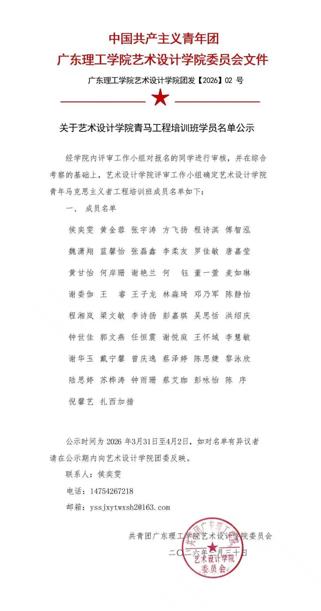 希望入选学员珍惜培养机会,严守纪律、勤学笃行,在理论学习中锤炼品格,在实践锻炼中提升能力,发挥青年骨干先锋作用,将专业所长与时代使命相结合,引领我院学子奋进争先。现将学员名单予以示,公示期内如有异议,请实名向学院团委书面反映。