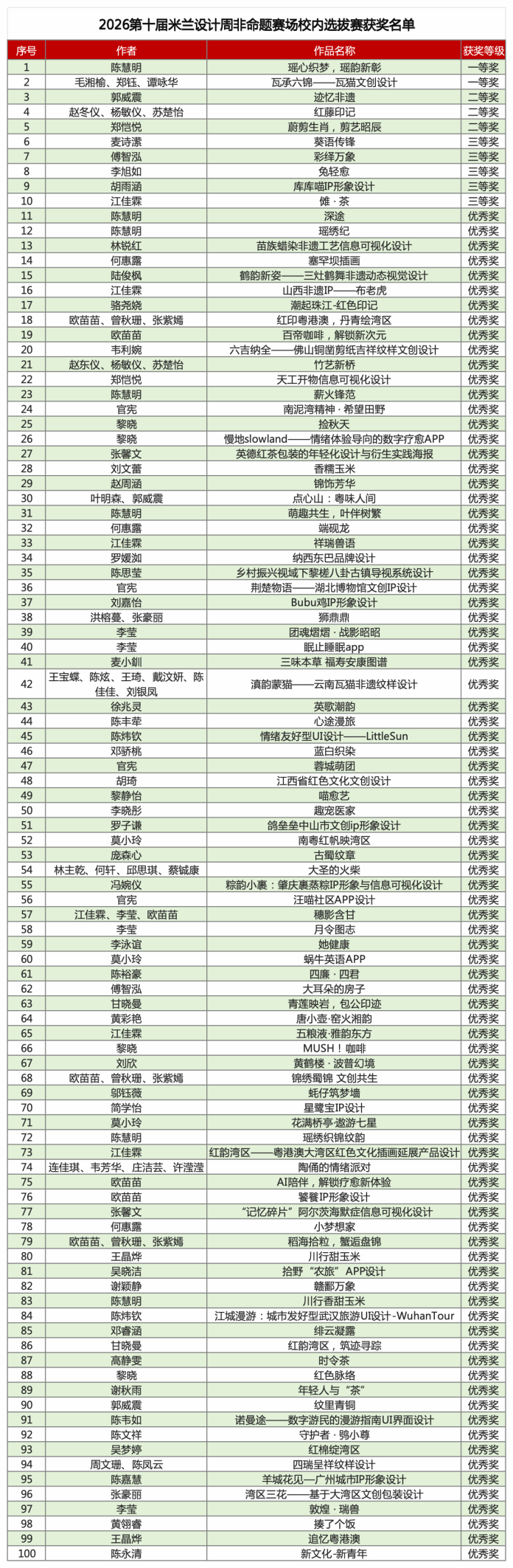本次校内选拔赛于2026年1月正式启动,面向全校学生开展作品征集。参赛作品涵盖视觉传达、产品设计、数字媒体、虚拟IP及时尚设计等多个方向,内容丰富、形式多样,整体呈现扎实的专业素养和蓬勃的创新活力。经过作品征集、资格审核与多轮评审等环节,最终评选出本次比赛各等级获奖作品,现予以公示。