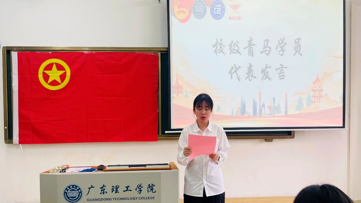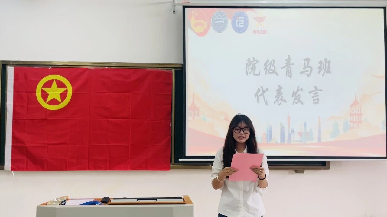 黄金蓉同学结合自身青马学习经历发言,她谈到,青马工程始终以引领青年树立正确价值观、时代观为目标,助力青年成长为合格的马克思主义者,以青春之我奔赴时代使命,为民族复兴不懈奋斗,为共产主义崇高理想砥砺前行。