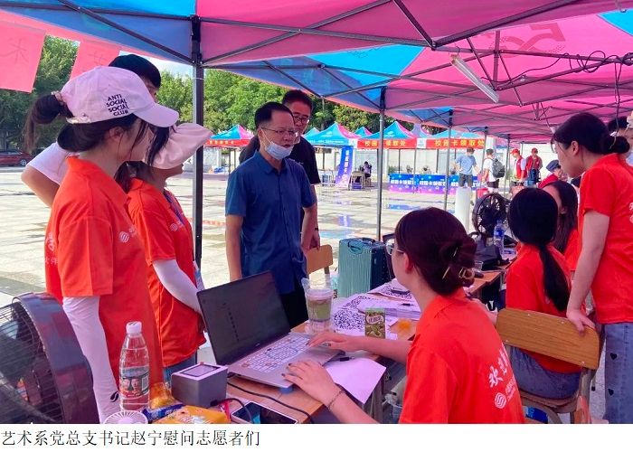 期间,艺术系党总支书记赵宁亲临科技广场慰问志愿者们,监督迎新工作的进行。赵宁书记询问志愿者们迎新的情况,并对志愿者辛苦付出大加赞赏。