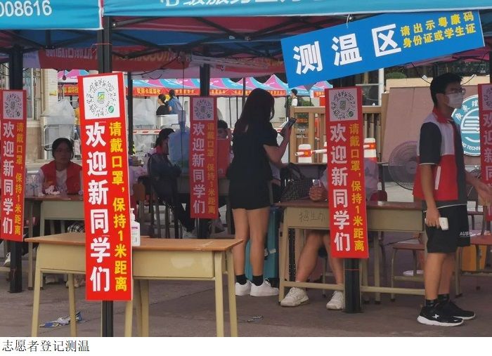 新生在到达校门口时,就会有相关志愿者进行接应和引导。同时校门口会有防疫登记志愿者为每位学生检查相关信息。按照防疫要求,报道新生及需持有48小时核酸检测报告,学校安保人员及志愿者会引导学生进行防疫登记并保持间距入校,对每一个入校人员进行登记测温,全力保证师生健康安全。