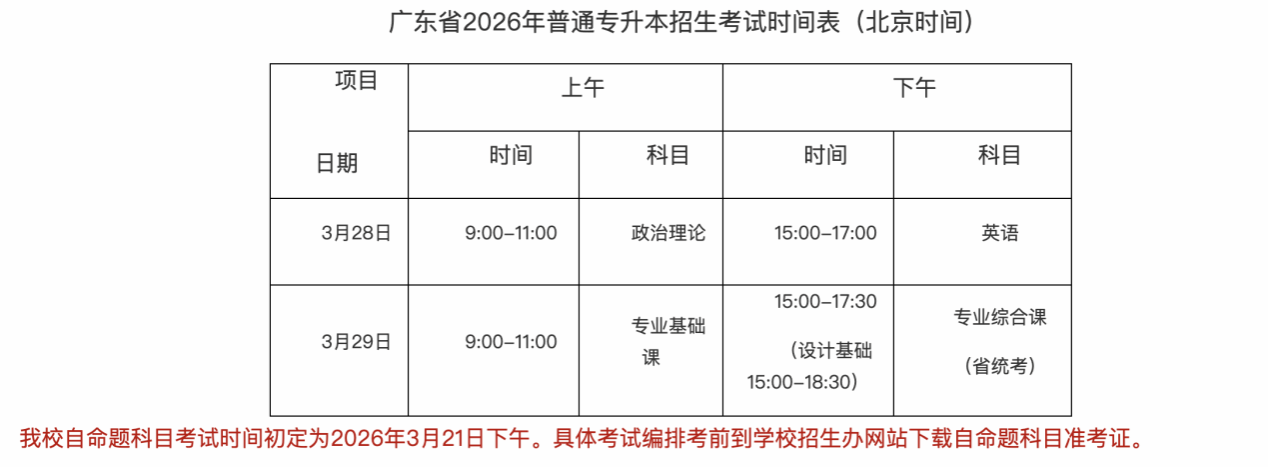 (一)2026年普通专升本考试科目共设4门,分别为2门公共课、1门专业基础课、1门专业综合课。公共课、专业基础课每科考试时间120分钟、卷面满分值100分;专业综合课每科考试时间150分钟(设计基础210分钟)、卷面满分值200分。