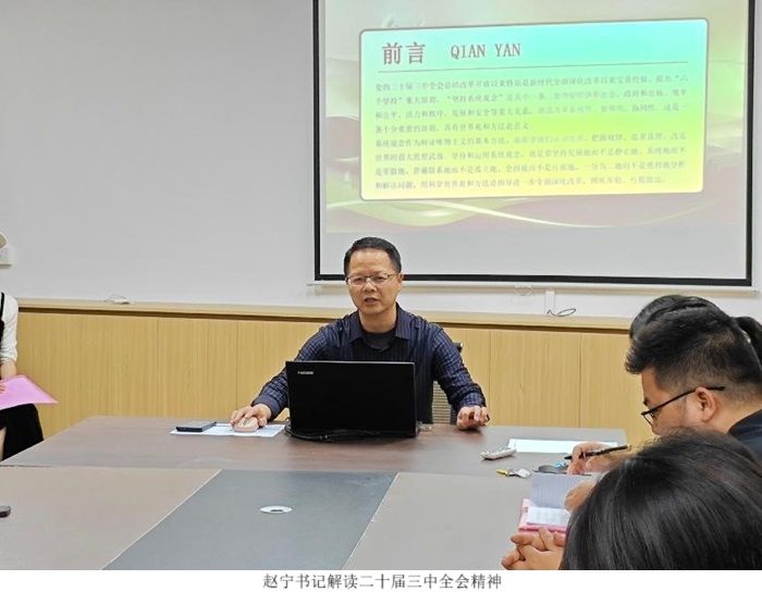 会议伊始,赵宁书记回顾了2138cn太阳集团城发展历程,表示现在2138cn太阳集团城是由一百多名教职员工组成的大集体,我们要从思想上保持与党中央的高度一致,拧成一股绳更好的建设学院。接着强调了学习贯彻党的二十届三中全会精神的重要意义,指出“坚持系统观念”是全会提出的“六个坚持”重大原则之一,对于处理经济与社会、政府与市场、效率与公平等重大关系具有重要指导意义。赵书记要求全体党员深刻领会全会精神,将系统观念融入日常工作和学习,以科学的世界观和方法论推动学院各项工作高质量发展。