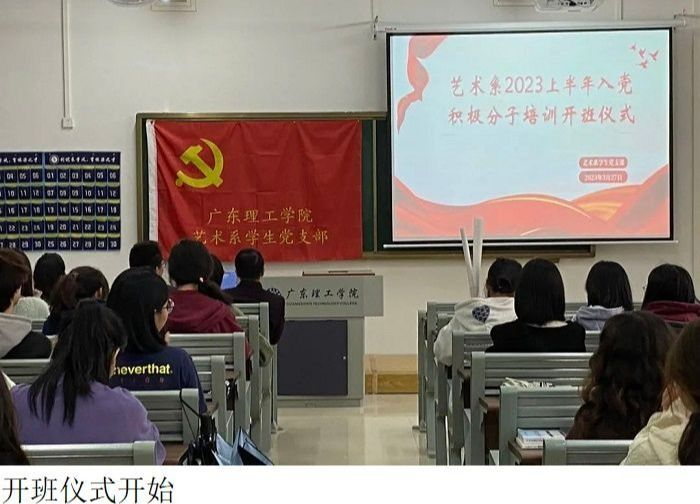 本网讯(艺术系新闻中心 吴时雨/陈丽欣)为了深入学习贯彻党的二十大精神,认真贯彻落实习近平总书记关于党建的重要论述,同时结合艺术系党总支党员工作发展要求。2023年3月27日中午,在52栋507召开了“艺术系2023年上半年入党积极分子培训班开班典礼”,系部党总支书记赵宁、学生党支部书记易晶晶、党员教师路正玉、张海玲、余丽嘉等,还有学生党支部全体成员和全体入党积极分子及共同参会。