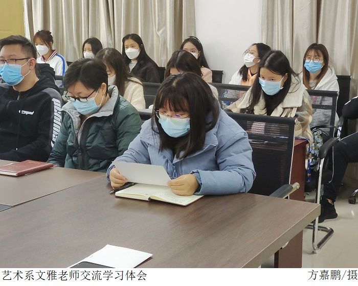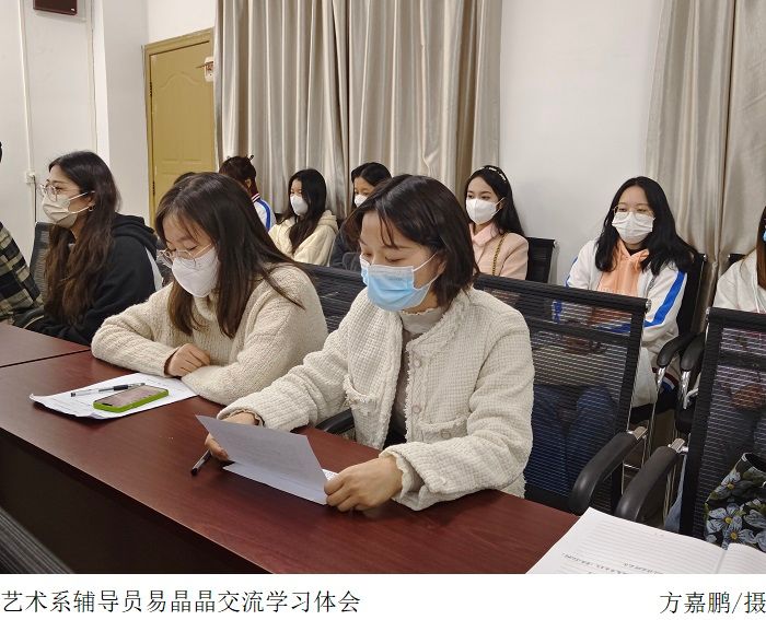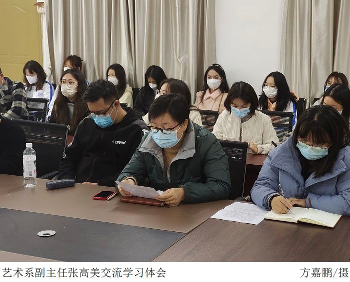 接着是张高美副主任、文雅和易晶晶老师交流分享党的二十大精神心得体会。张高美副主任表示,作为一名高校党员老师,她会坚持以党的二十大精神为指引,进一步明确新时代立德树人的目标,为国育人,激励并引导一批又一批的学生怀抱梦想,去实现人生价值。随后,文雅老师表示作为一名党员老师,感到非常自豪。学习宣传贯彻党的二十大精神是首要政治任务,她会在本职岗位上兢兢业业,严于律己,并起好带头作用,给学生做好榜样作用。紧接着,易晶晶老师表示身为艺术系学生党支部书记,会将深入学习宣传贯彻党的二十大精神,融入到各项工作中。并起到党员老师的带头作用,把工作做好,带动艺术系全体学生学习党的二十大精神。