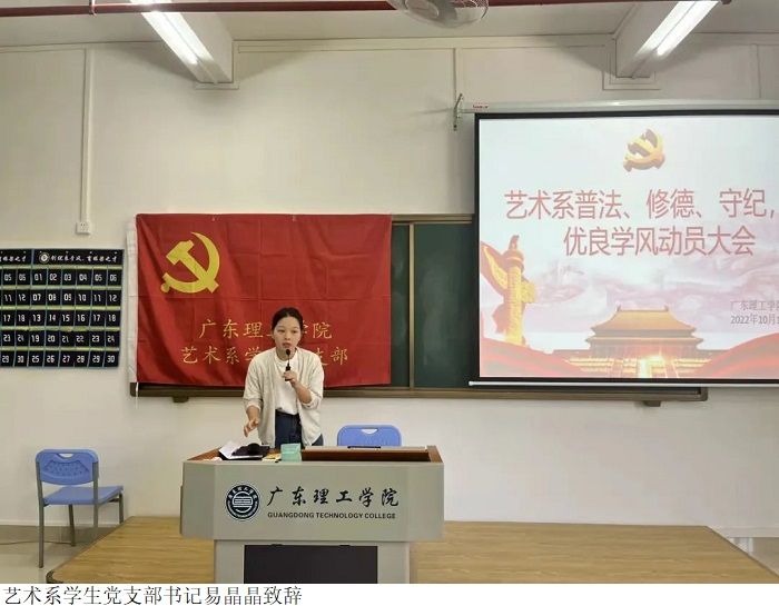 本网讯(艺术系新闻中心 徐盈盈/钟紫霞)为了进一步全面贯彻党的教育方针,推进学校的法治教育和思想政治教育,加强疫情防控常态化背景下的学风建设,坚持和落实依法治校,以德治校。艺术系于2022年10月14日在52栋504召开艺术系“普法·修德·守纪,创建良好学风”活动动员大会,艺术系全体辅导员以及22级班长团支书参会。会议由艺术系学生党支部书记易晶晶主持。