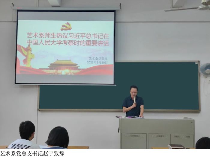 本网讯(艺术系新闻中心 贺元慧/高如意)教育是民族振兴、社会进步的重要基石,是功在当代、利在千秋的德政工程,4月25日习近平总书记来到中国人民大学考察调研。此次习近平总书记在中国人民大学考察时的重要讲话精神在我系师生中引发热烈反响。艺术系于2022年5月10日下午,在六栋102教室学习习近平总书记在中国人民大学考察时的重要讲话精神,艺术系全体老师参与学习。