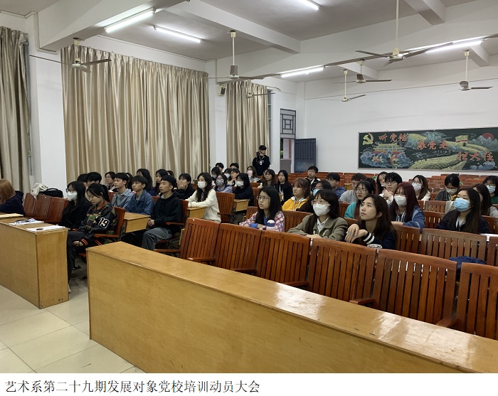 本网讯(艺术系新闻中心 罗家栋/高如意)为加强发展对象对中国共产党的认识,强化党校学员的思想教育,组织发展对象积极参加学校党校培训班,4月18日下午,艺术系在6104召开第二十九期发展对象党校培训班动员大会。会议由学生党支部书记易晶晶主持,第二十九期发展对象及学生党支部全体成员参会。
