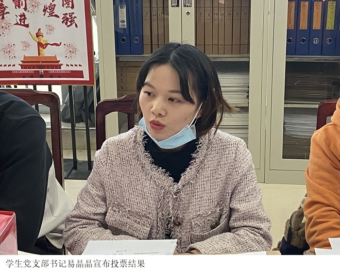 易晶晶宣布投票结果:经过支部大会讨论,张汶娟、麦泽辉、许蓝月、徐浣玥、陈文程、蒋秀榆、曹琳、熊祝浩、杨杰霖9名同志在考察期能以党员标准要求自己,重视理论学习,工作勤奋,发挥了党员的模范带头作用,已符合一名预备党员标准,同意以上九名同志发展为预备党员。