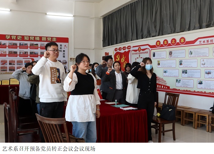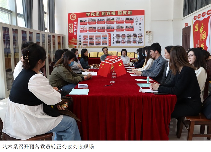 本网讯(艺术系宣传部 罗家栋)为了更好地发展艺术系学生党员,提升学生党支部组织的凝聚力、创造力、服务力和执行力。艺术系于2021年11月29日12时10分,在艺术楼一楼党员活动室召开预备党员转正会议,大会就预备党员龙媛等8名同志的转正问题进行讨论,会议由学生党支部书记易晶晶主持,党总支书记赵宁、支部党员们参会。