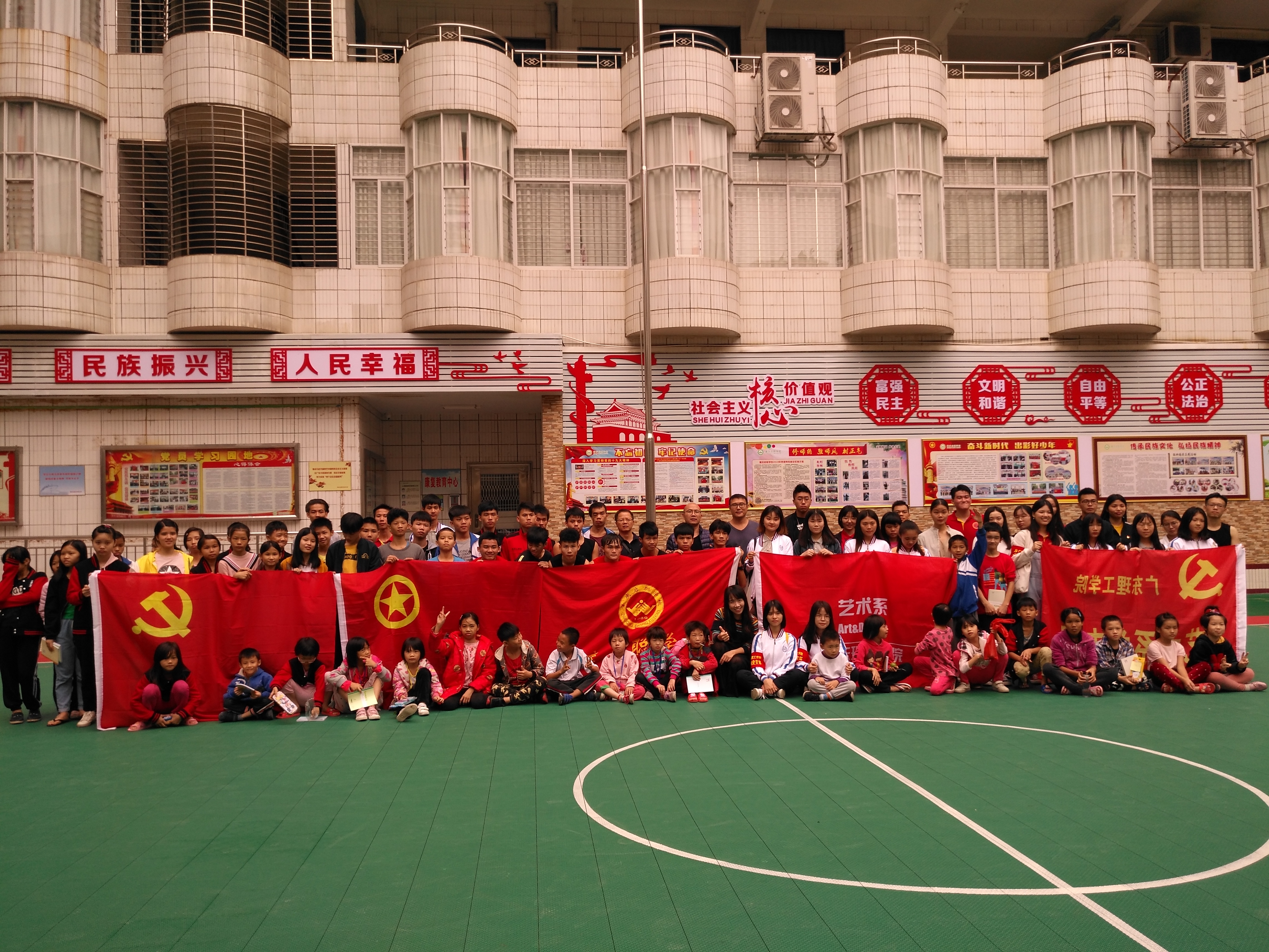 本网讯(党支部 杨梓锐 陈治洲) 2018年11月17日上午,在艺术系党总支赵宁书记的带领下,花仕旺副主任、学工部吴楚升部长、学生党支部书记吴云老师、艺术设计教研室主任陈爱霞老师、教工党支部宣传部部长农旭安老师以及其他党员老师、学生党员和学生代表一同来到启聪学校。